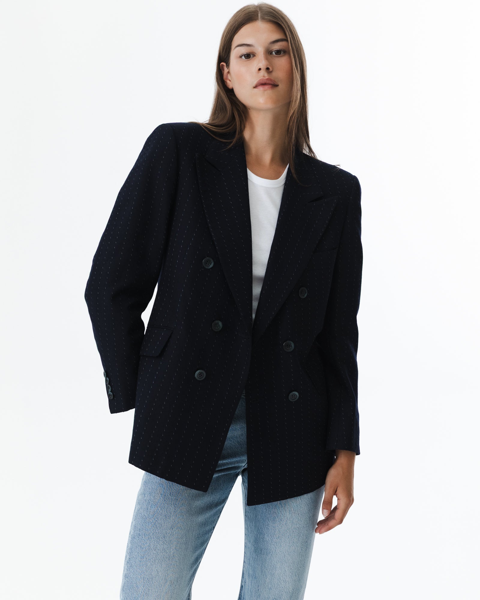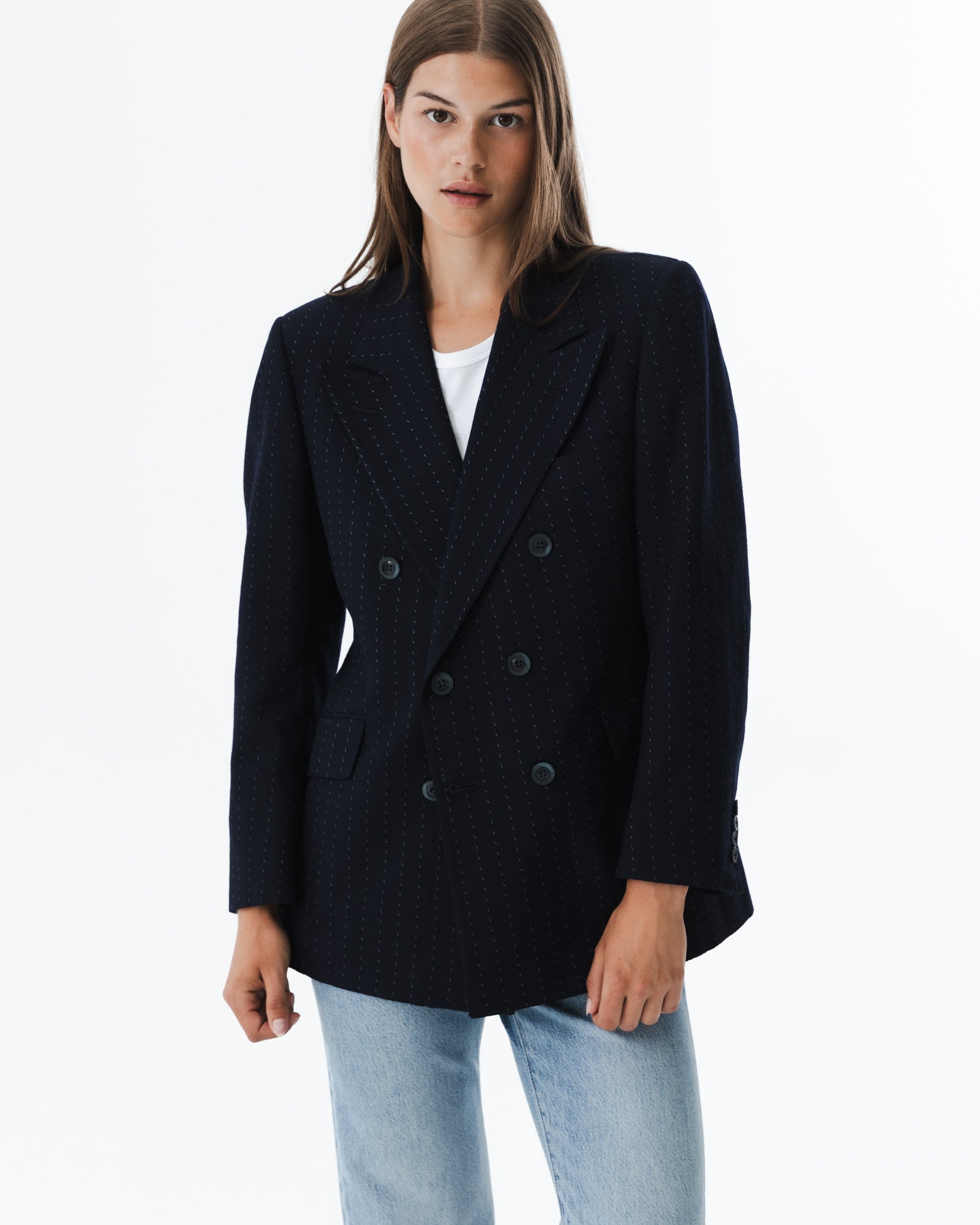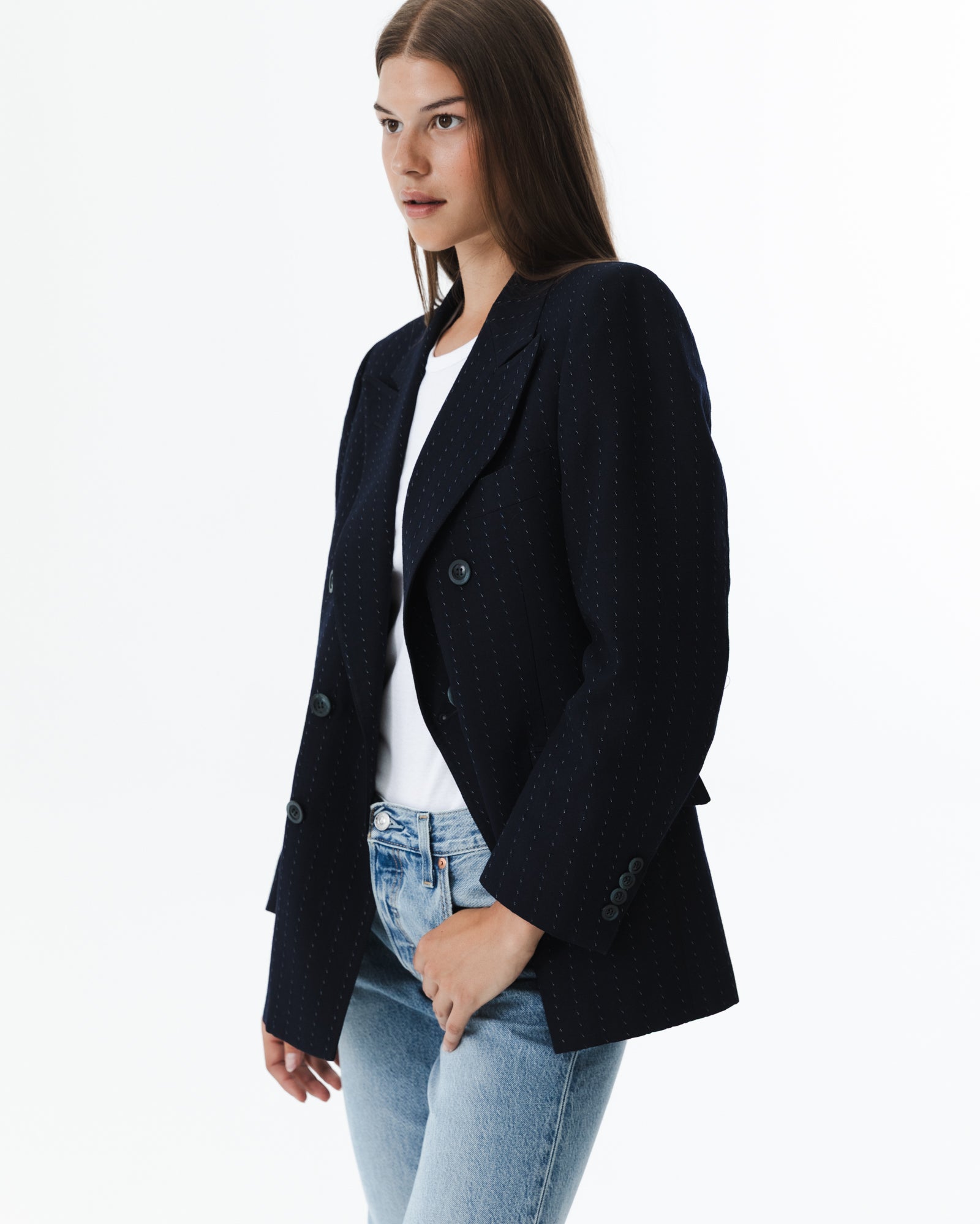 This vintage one-of-a-kind double-breasted blazer stands out in a rich navy color with pinstripes. It has a stunning shape and classic tailoring.