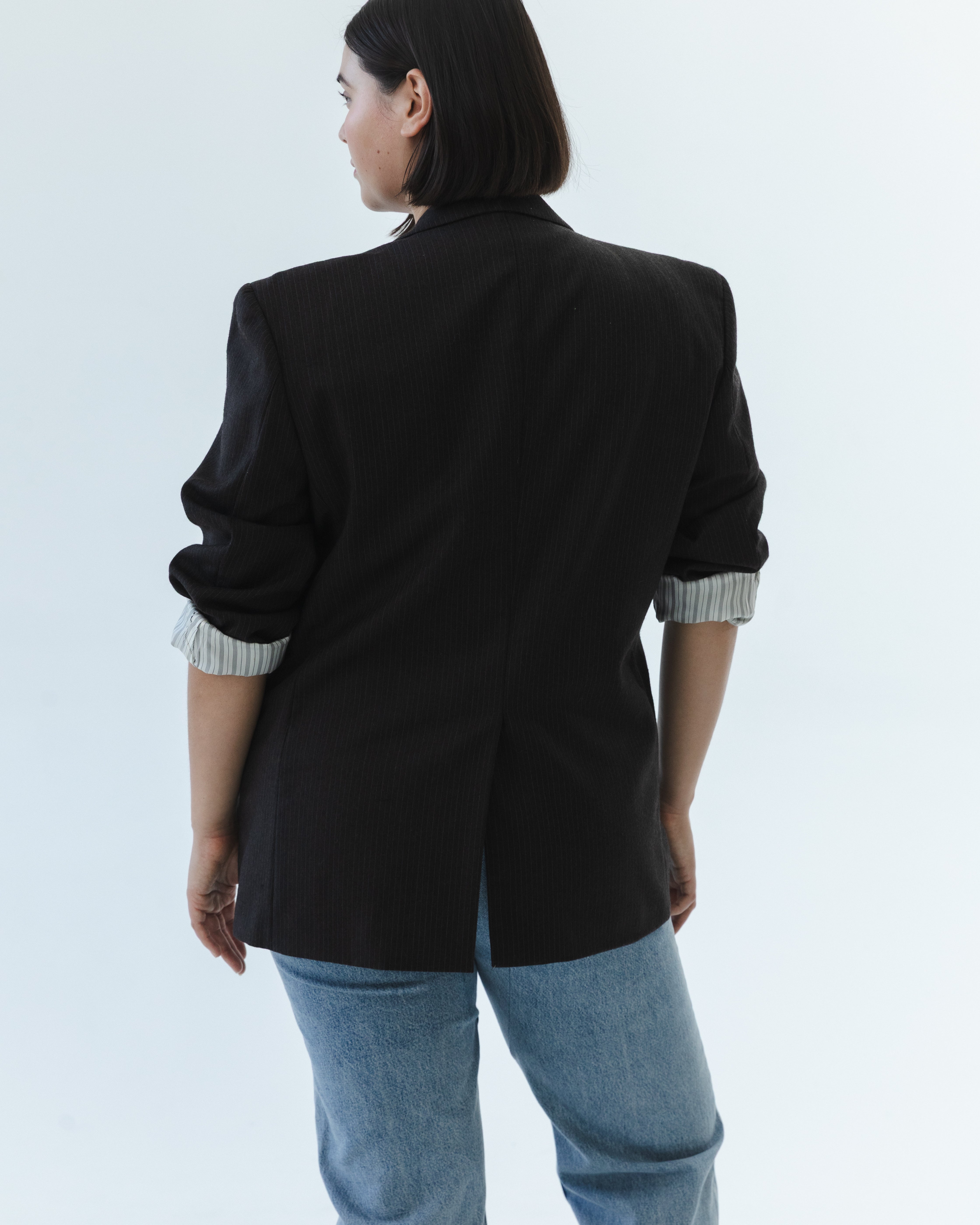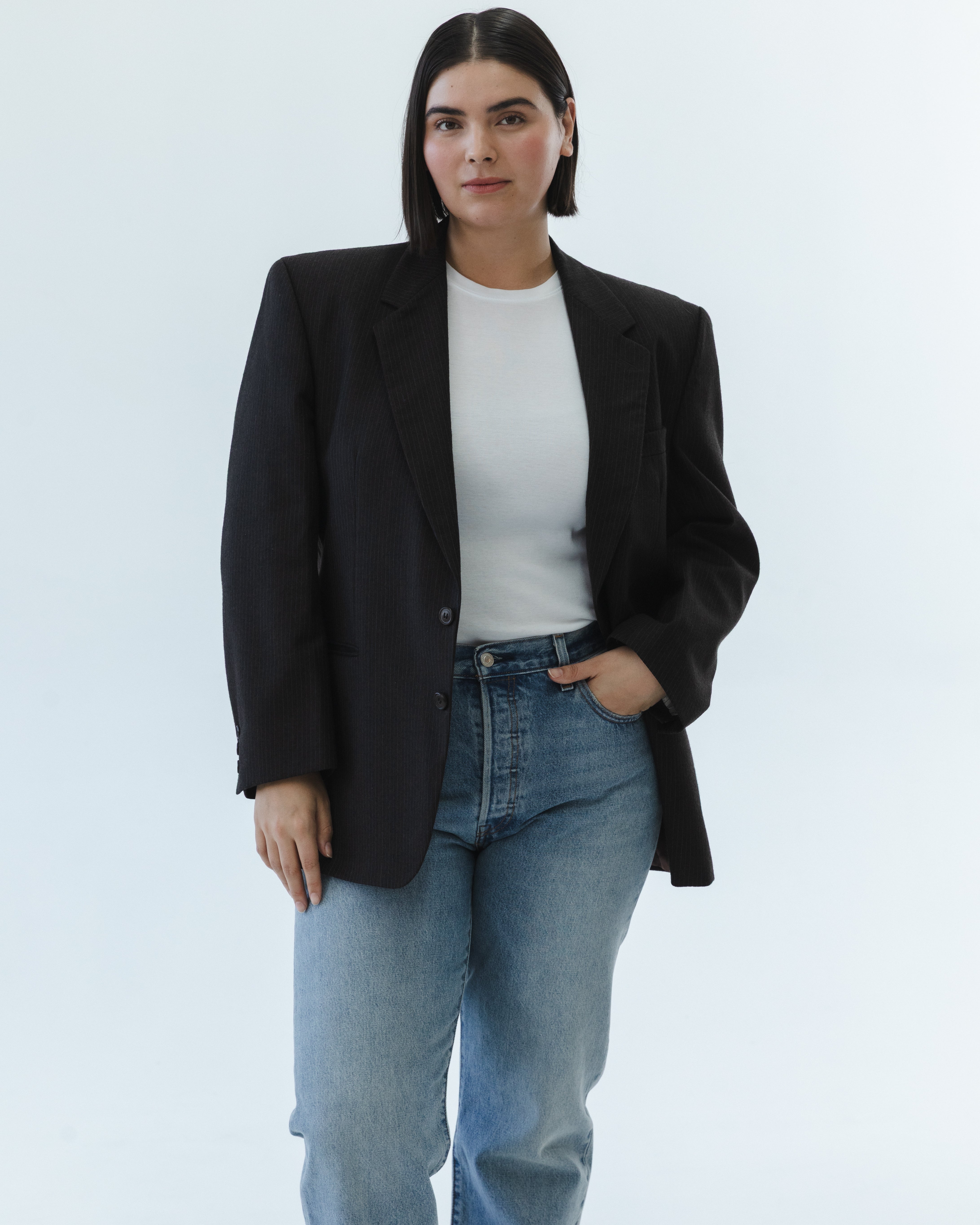 This blazer is a classic fit and comes in a beautiful dark brown color with pinstripes.