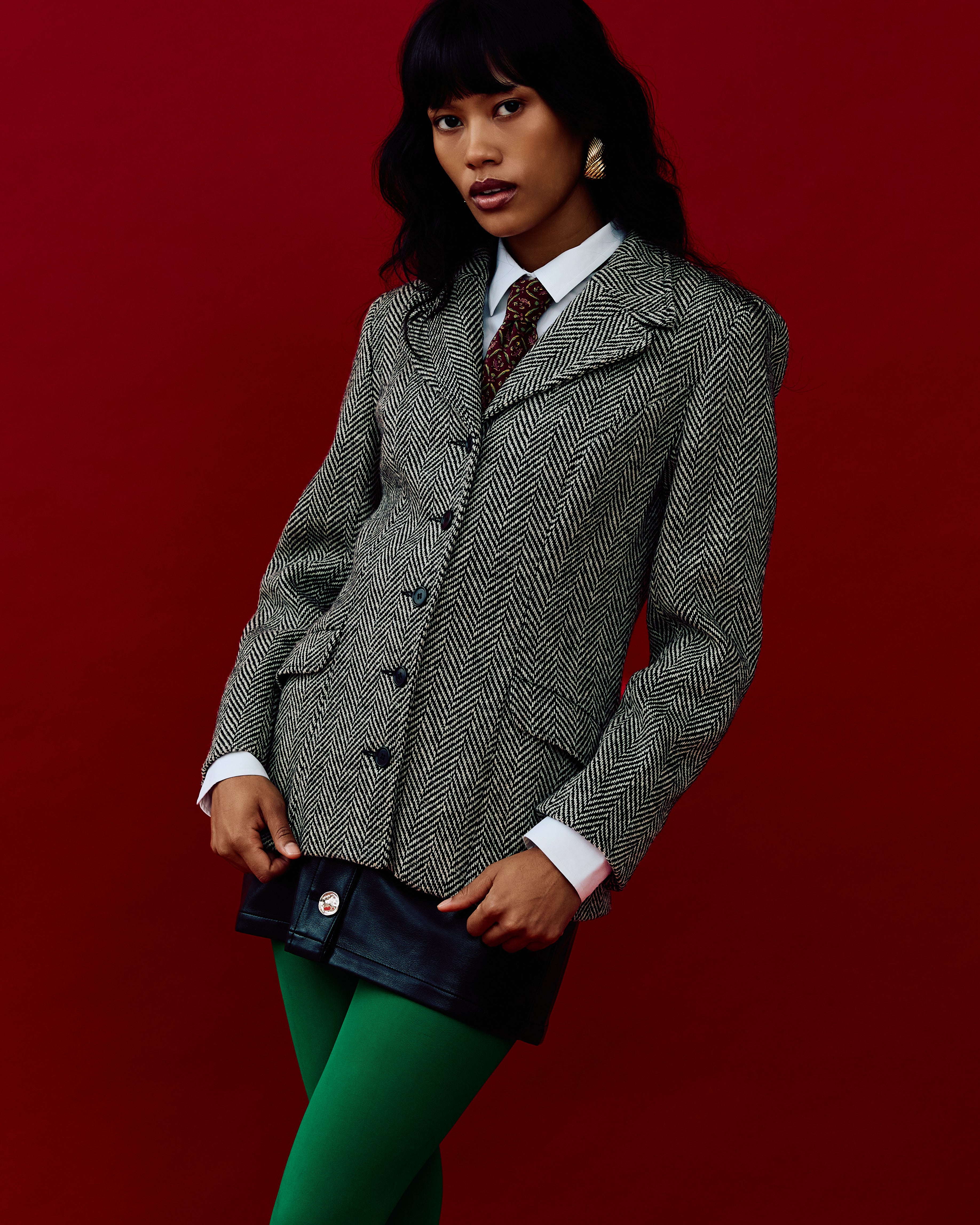This stunning vintage blazer features a classic herringbone pattern and beautiful shape. It is perfect for layering over button-downs or thin sweaters.