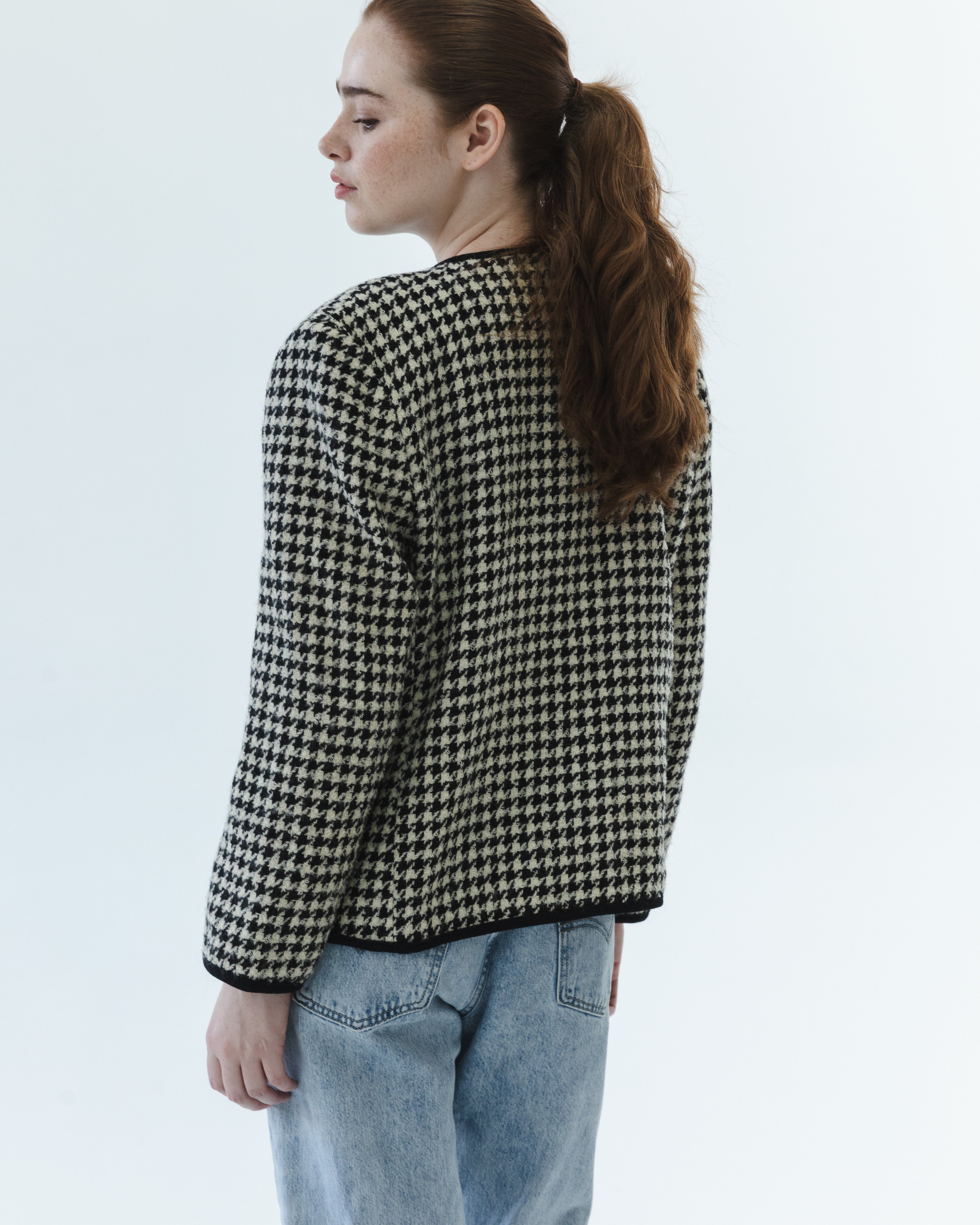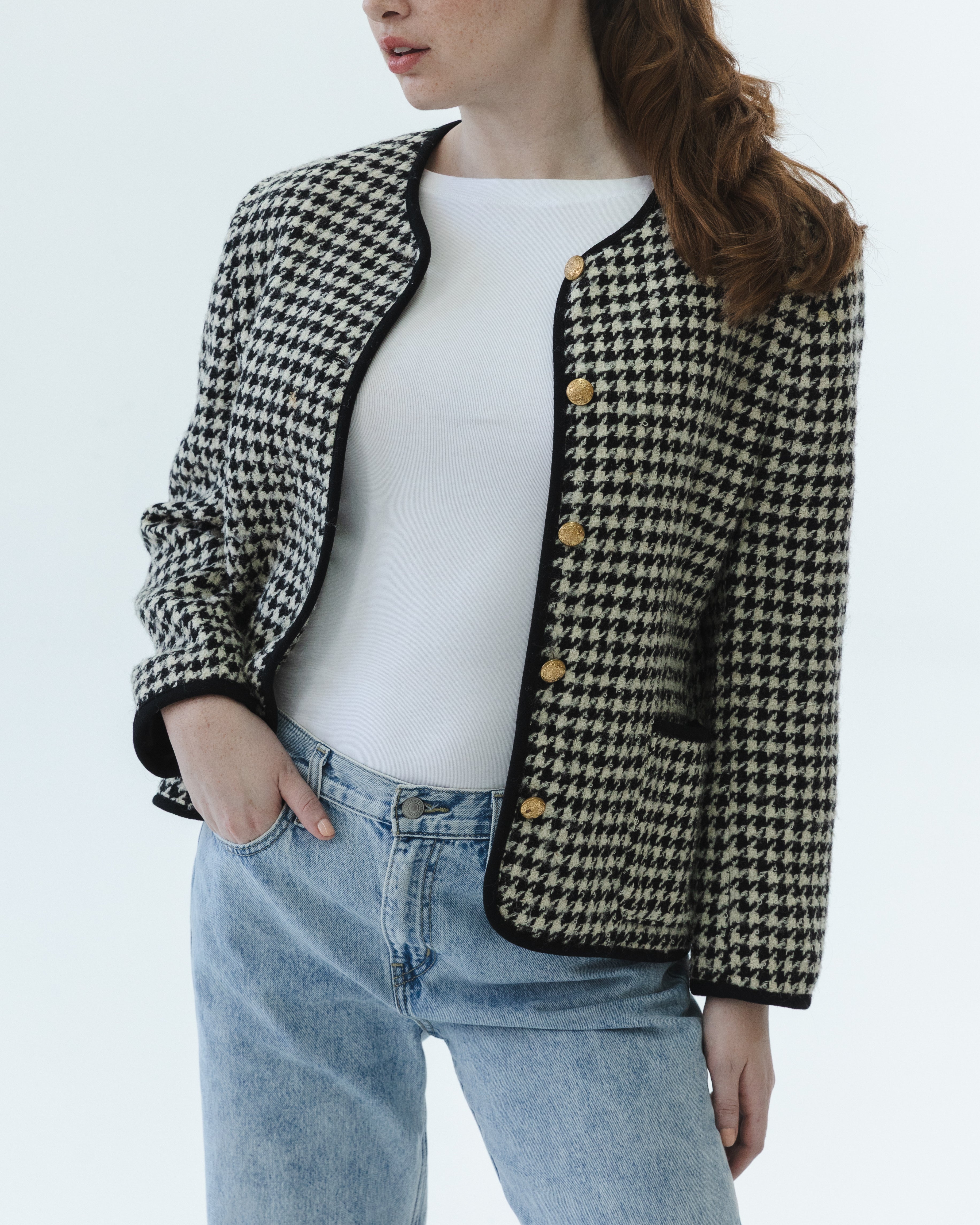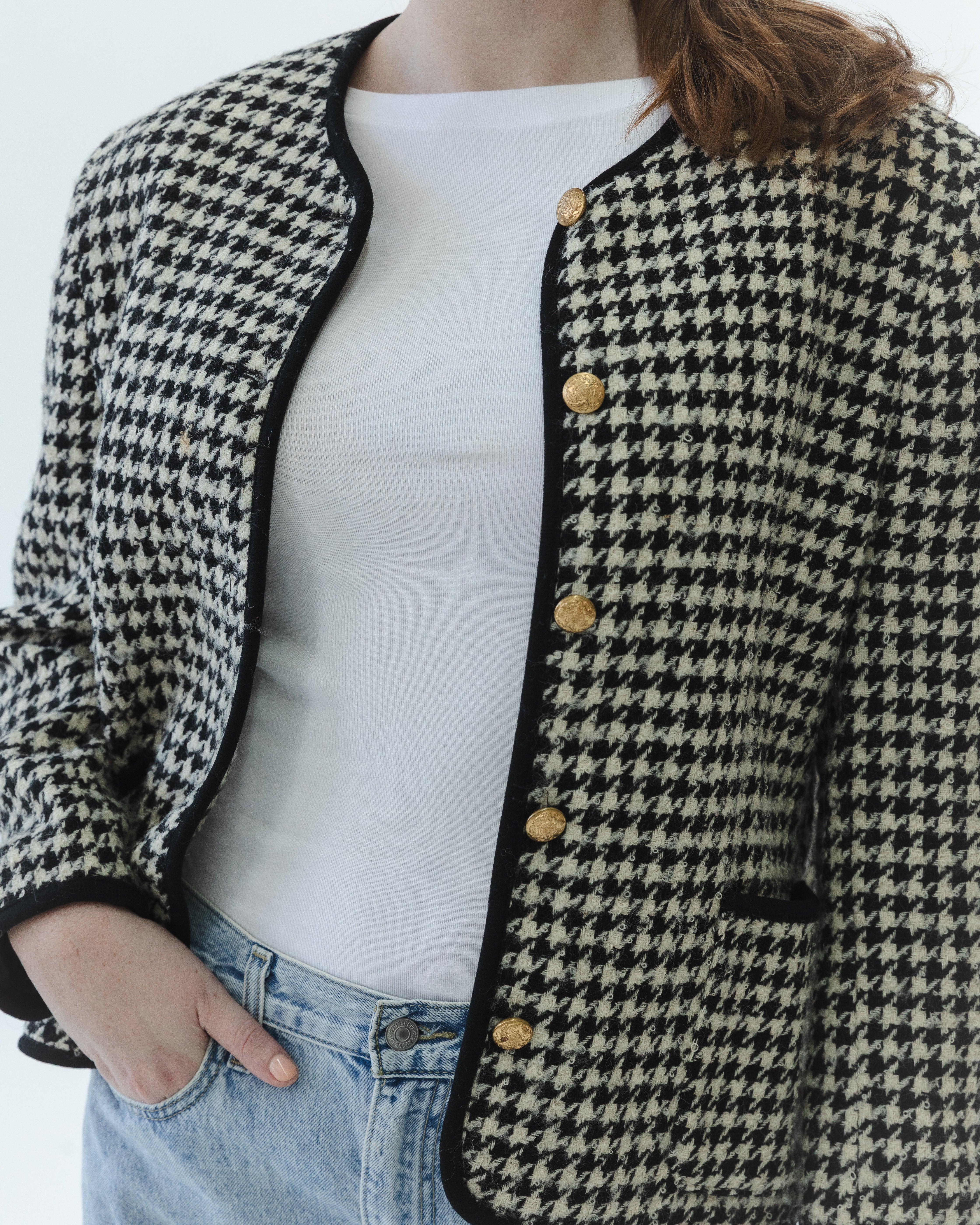 This vintage cardigan jacket comes in black and white houndstooth with gold buttons.
