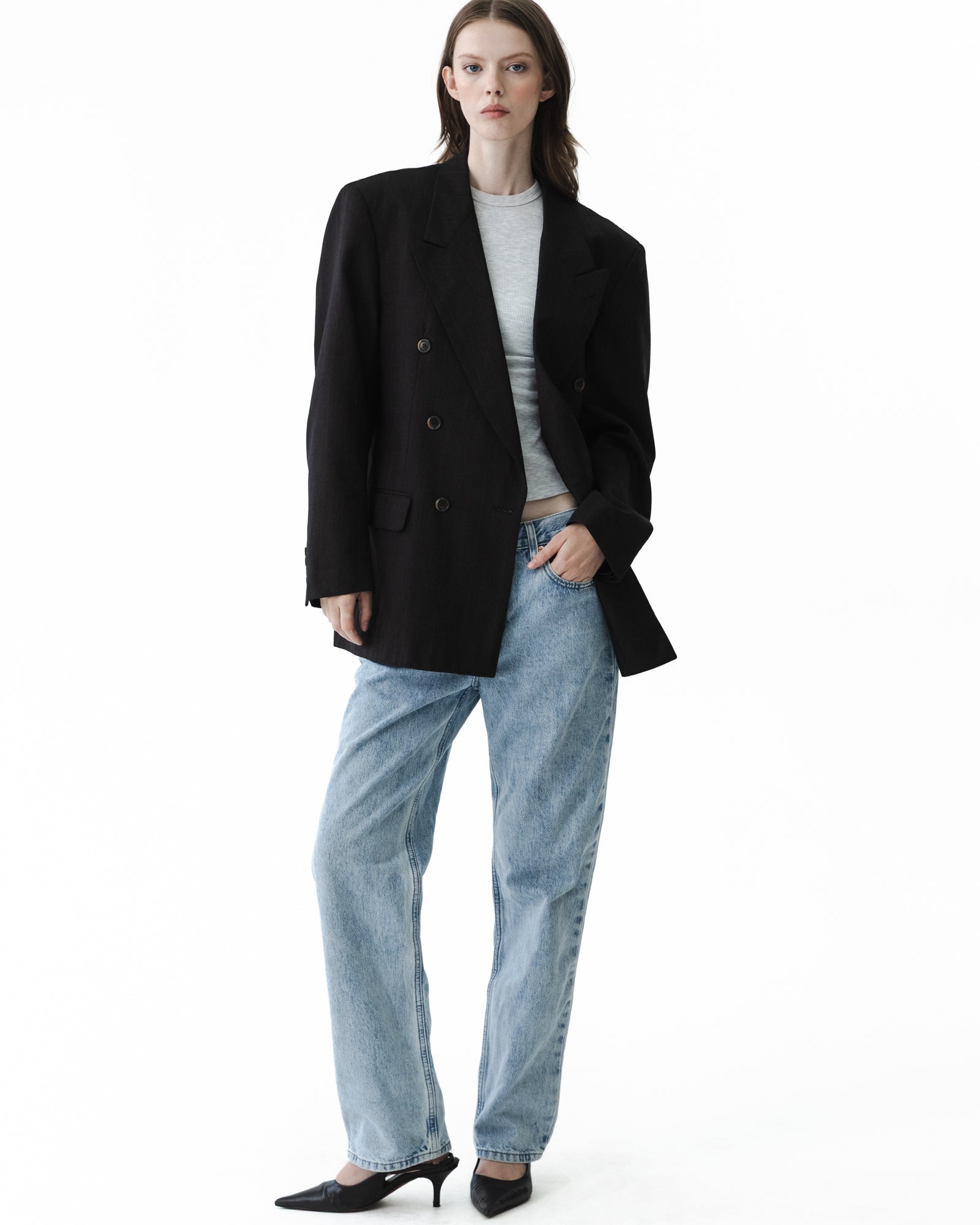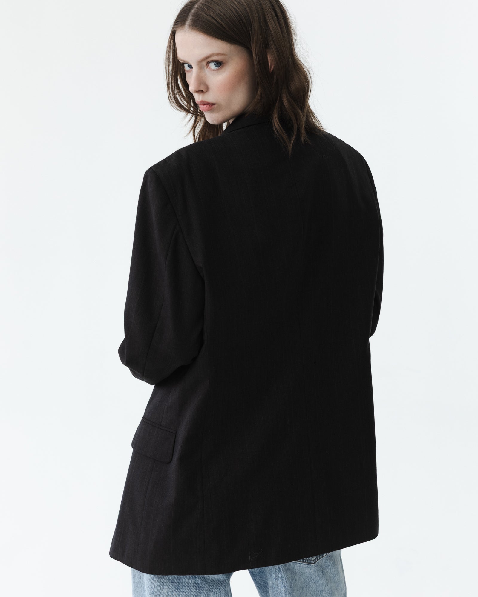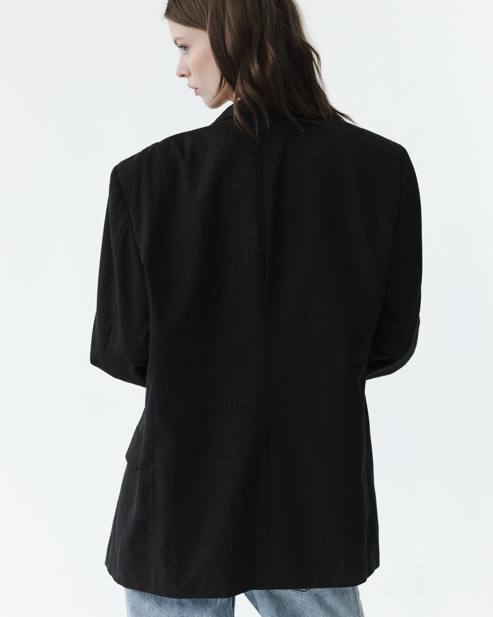 Stunning double-breasted blazer in a brown-ish black color. This one has a strong shape and definitely makes a statement.
