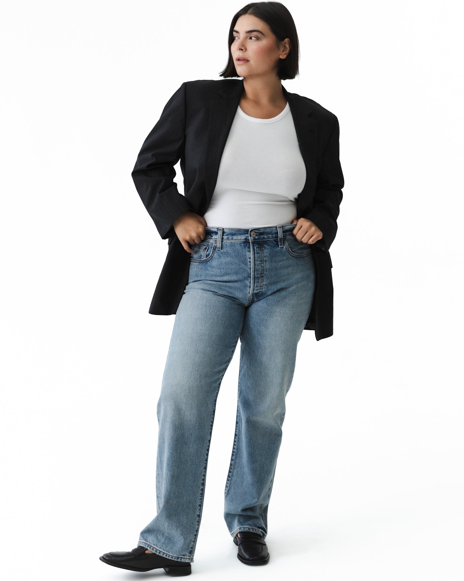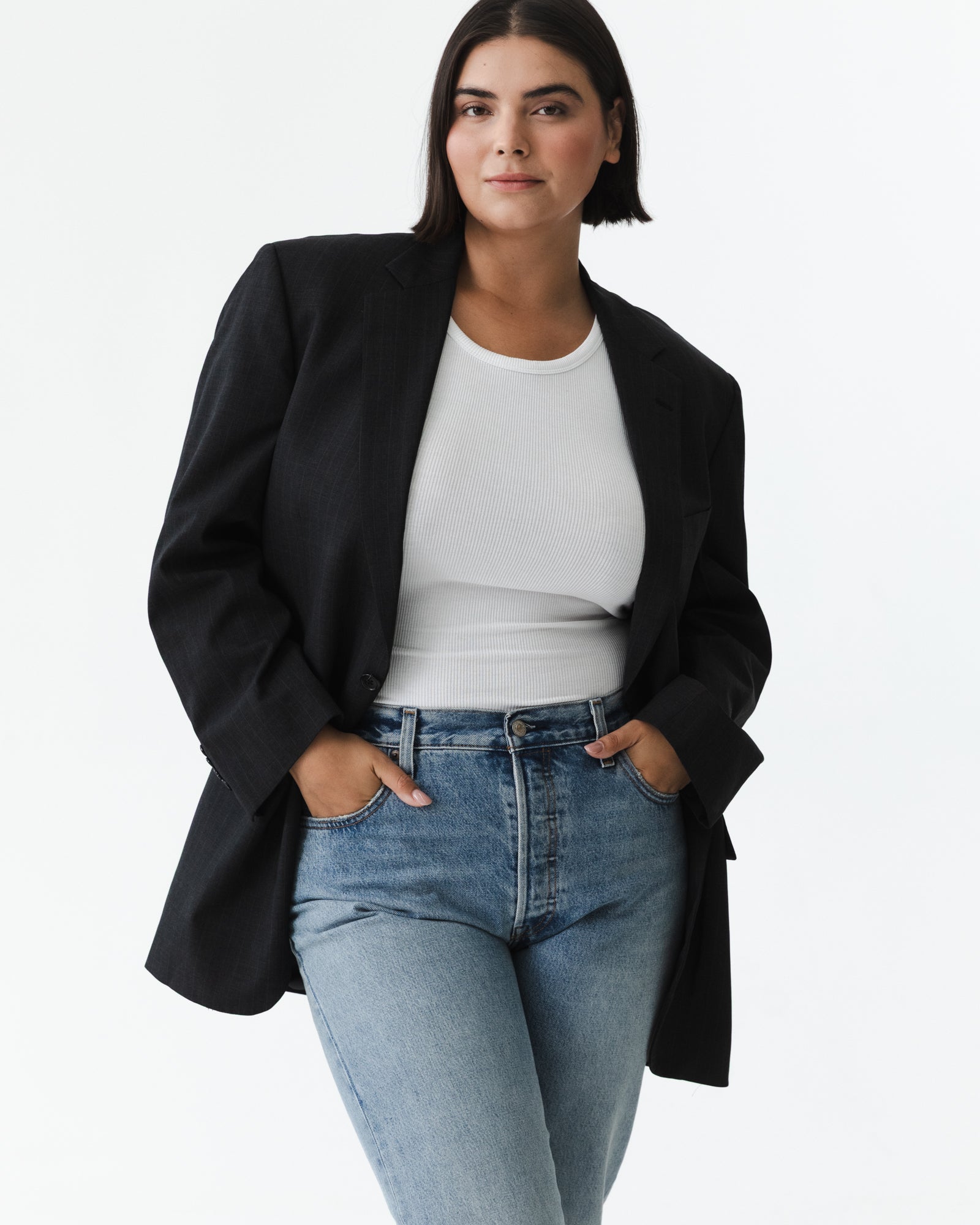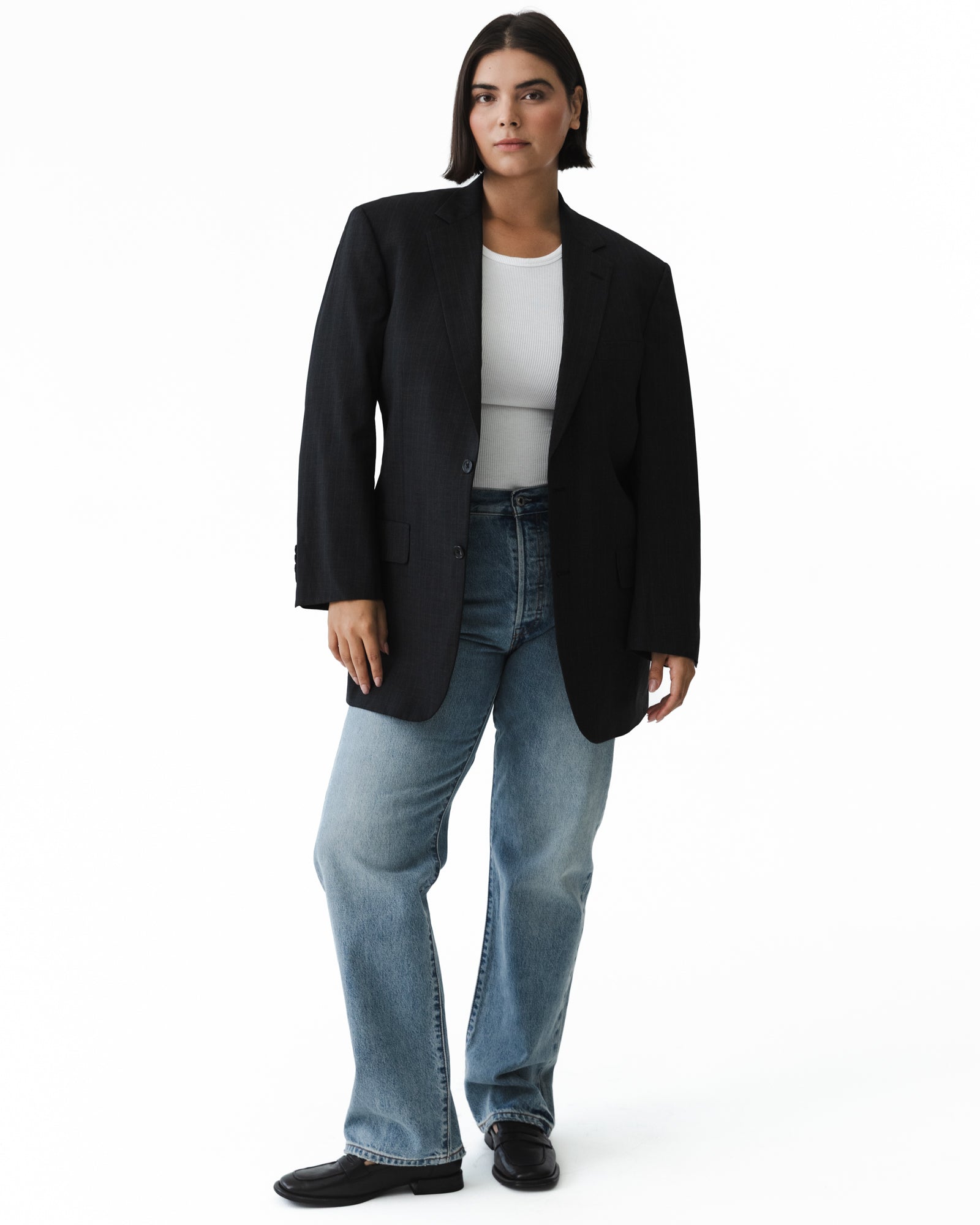 This vintage blazer features a classic structured silhouette at a slightly longer length.