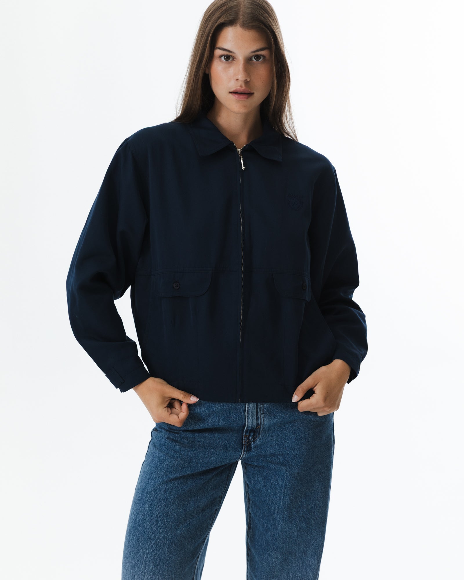 Vintage handpicked navy blue bomber style zip-up jacket. Silky material with an embroidered "G" crest logo on the chest.