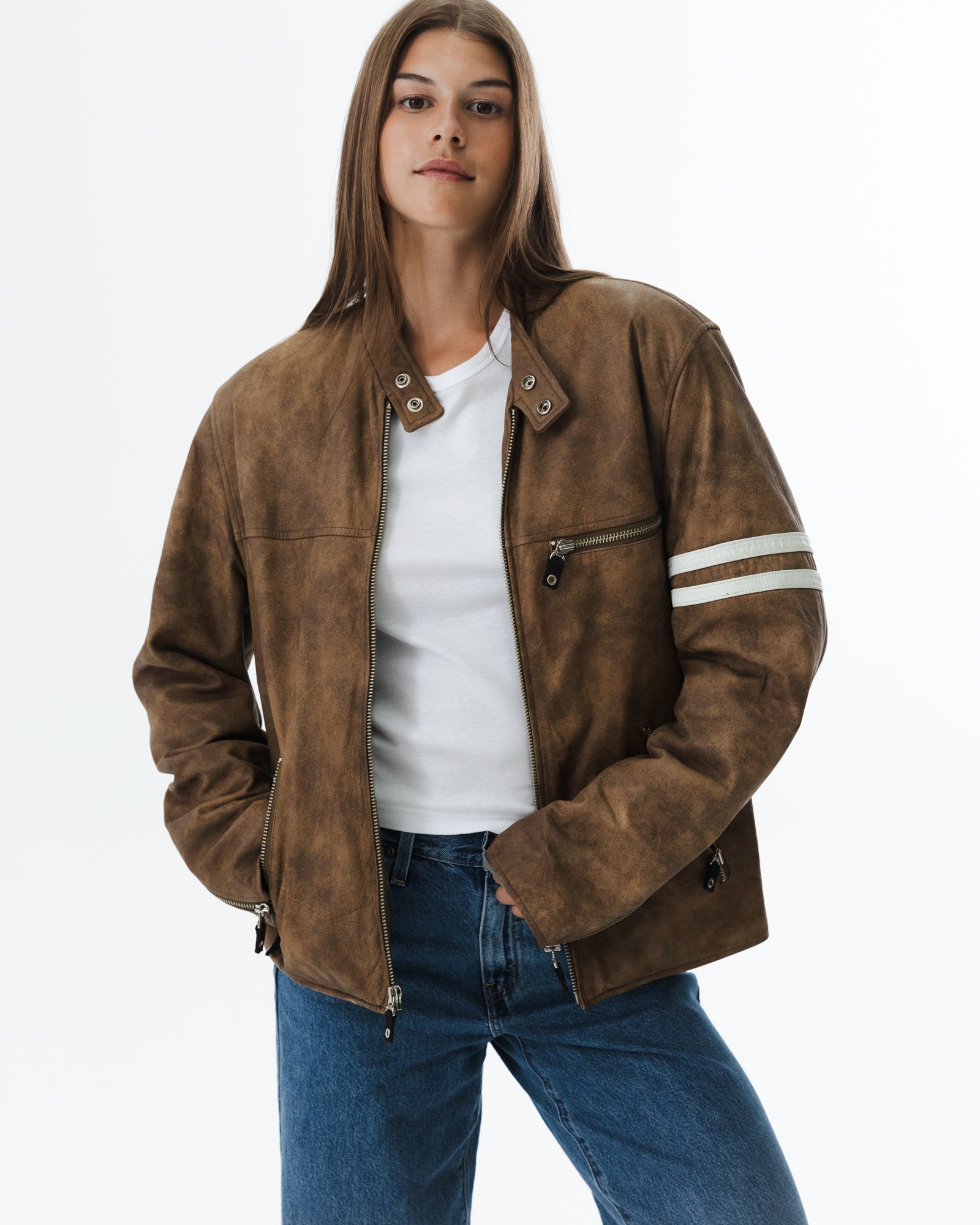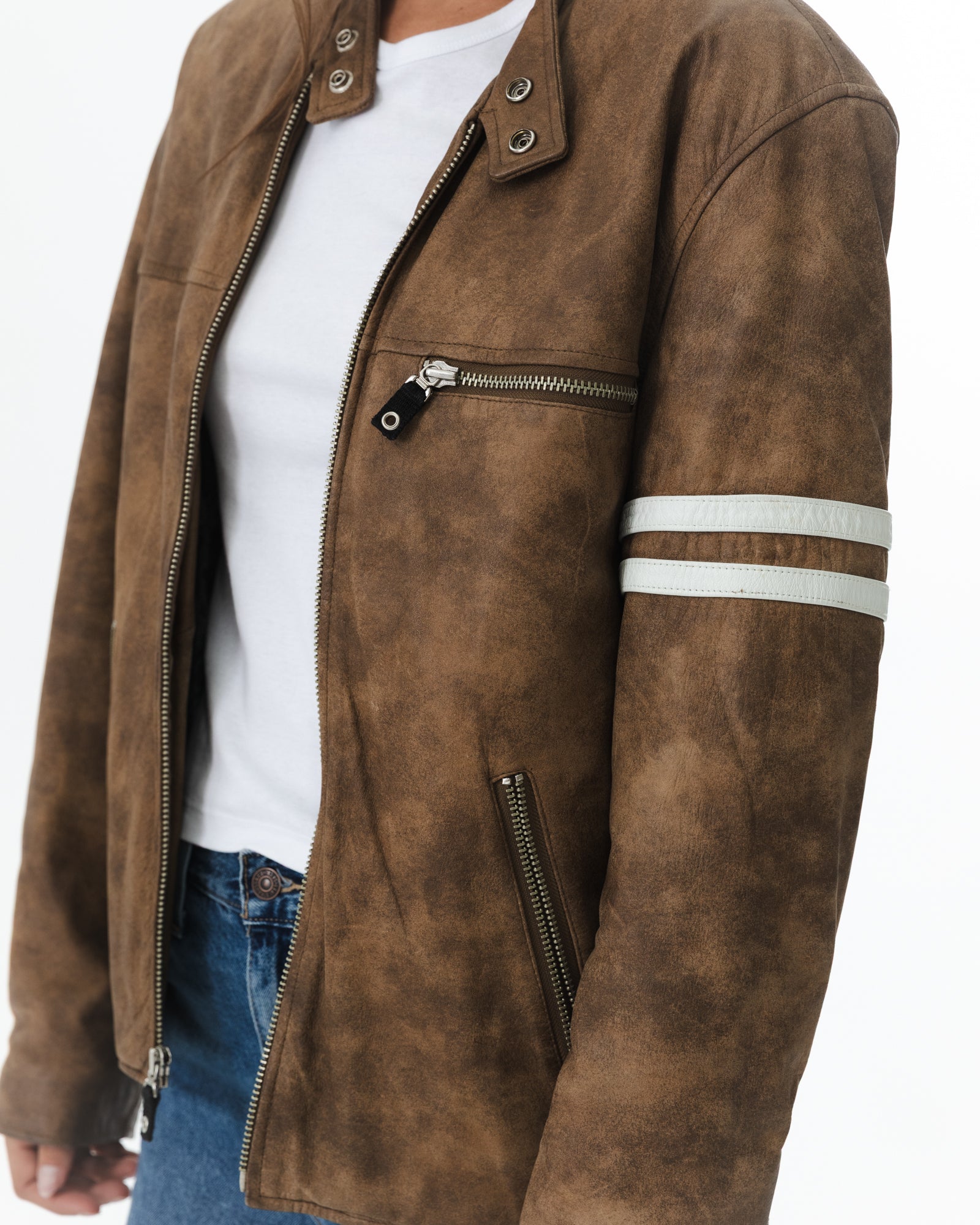 Vintage beautifully structured leather jacket in a rich brown color. Made from a durable leather and fully lined. We are obsessed!